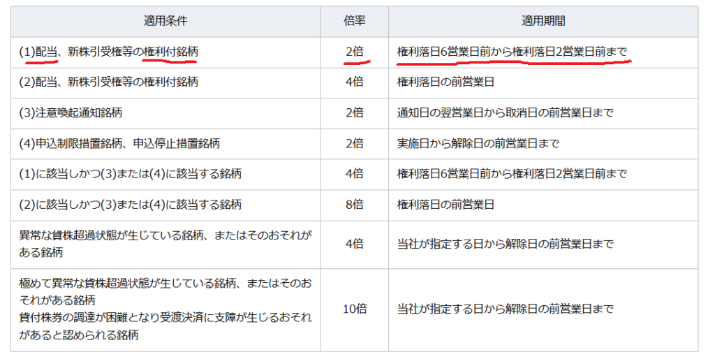 また、配当など権利落ちがある場合は、前日は4倍、その前1週間は2倍の倍率が適用されます。トレンドマイクロの場合は12/28が配当落ち日で、12/25は3営業日前なので2倍適用となります。